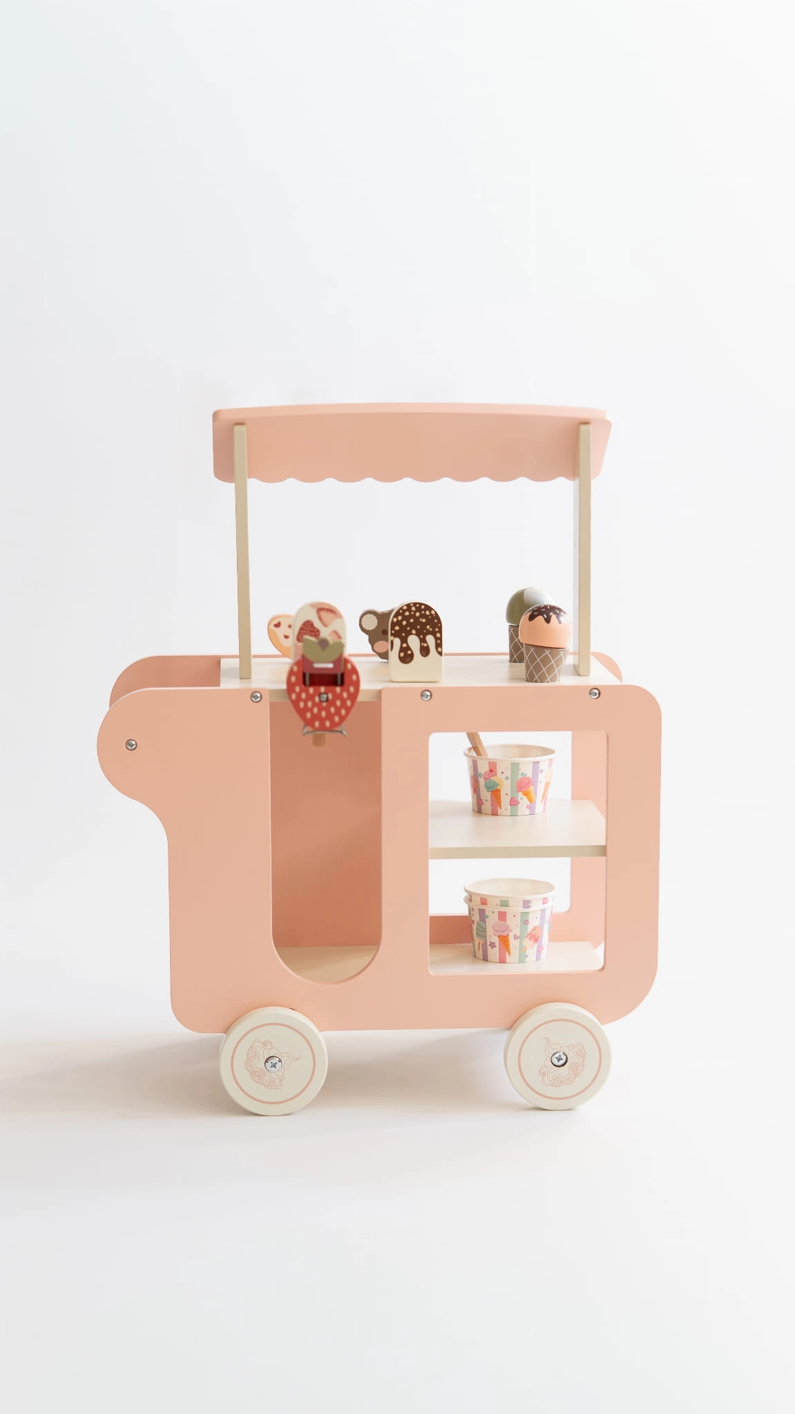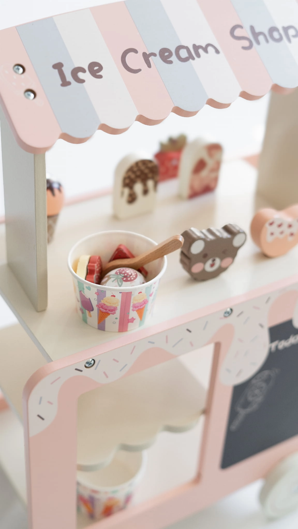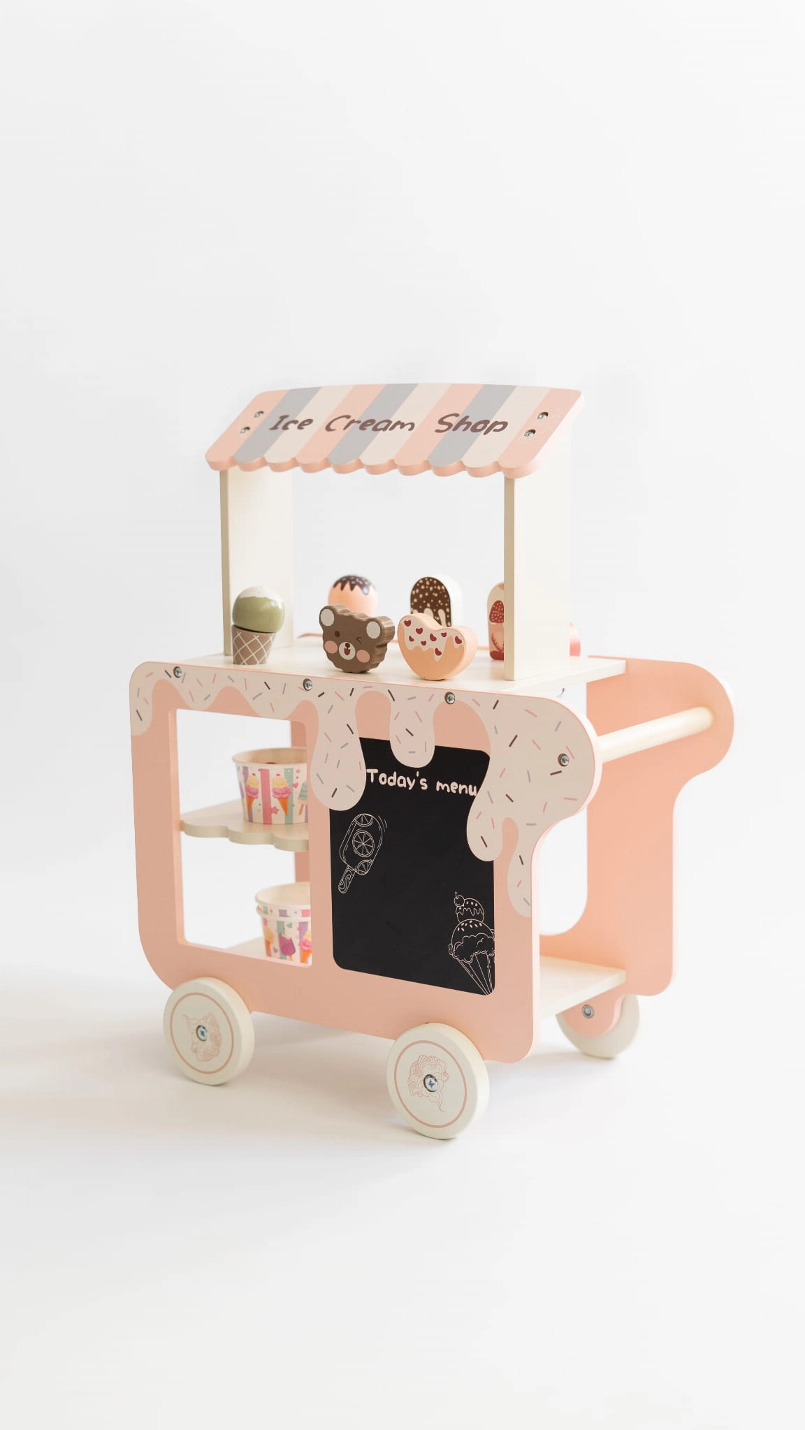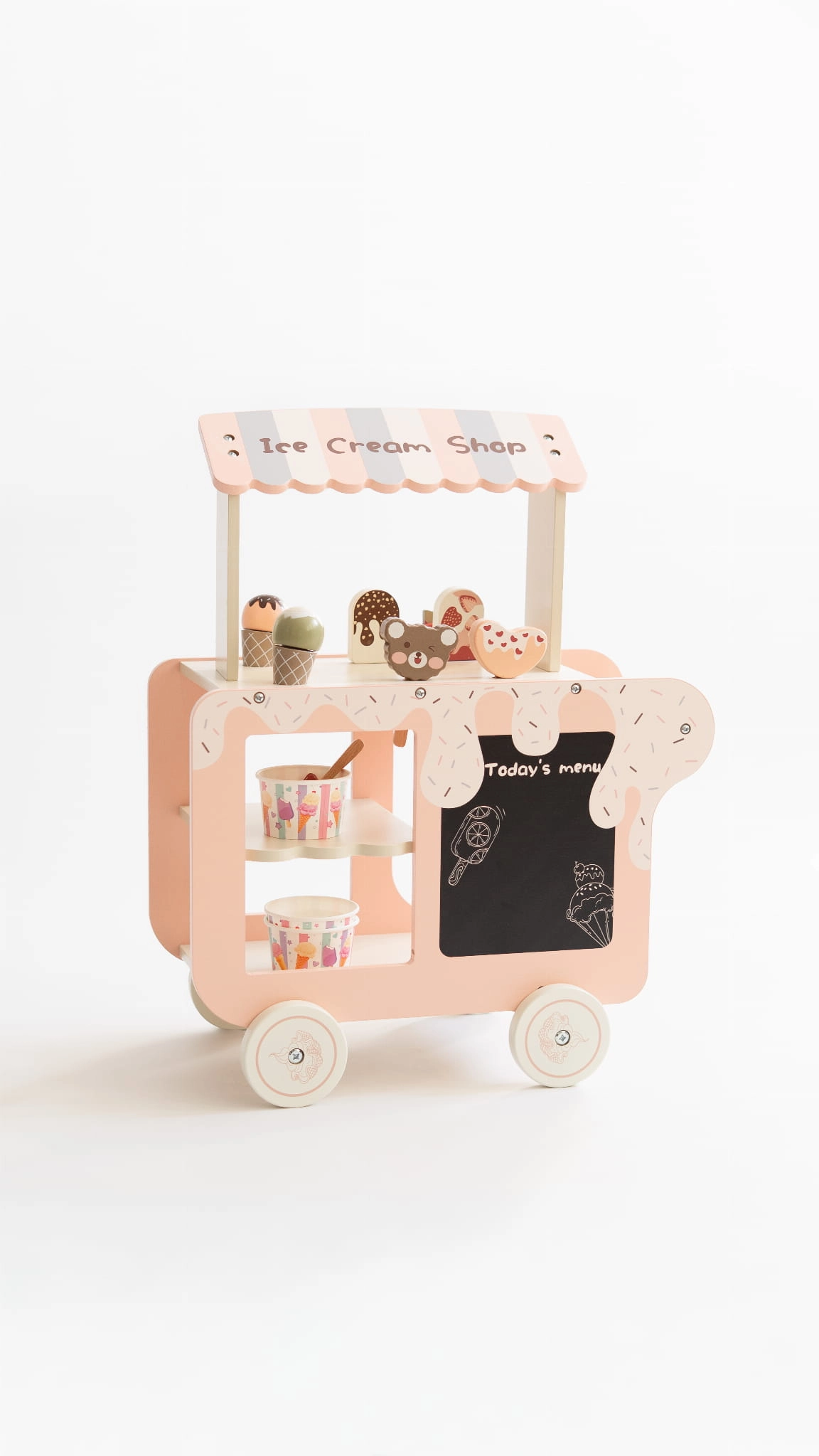 Urocza drewniana lodziarnia na kółkach, która rozwija wyobraźnię i zachęca do kreatywnej zabawy w odgrywanie ról.
