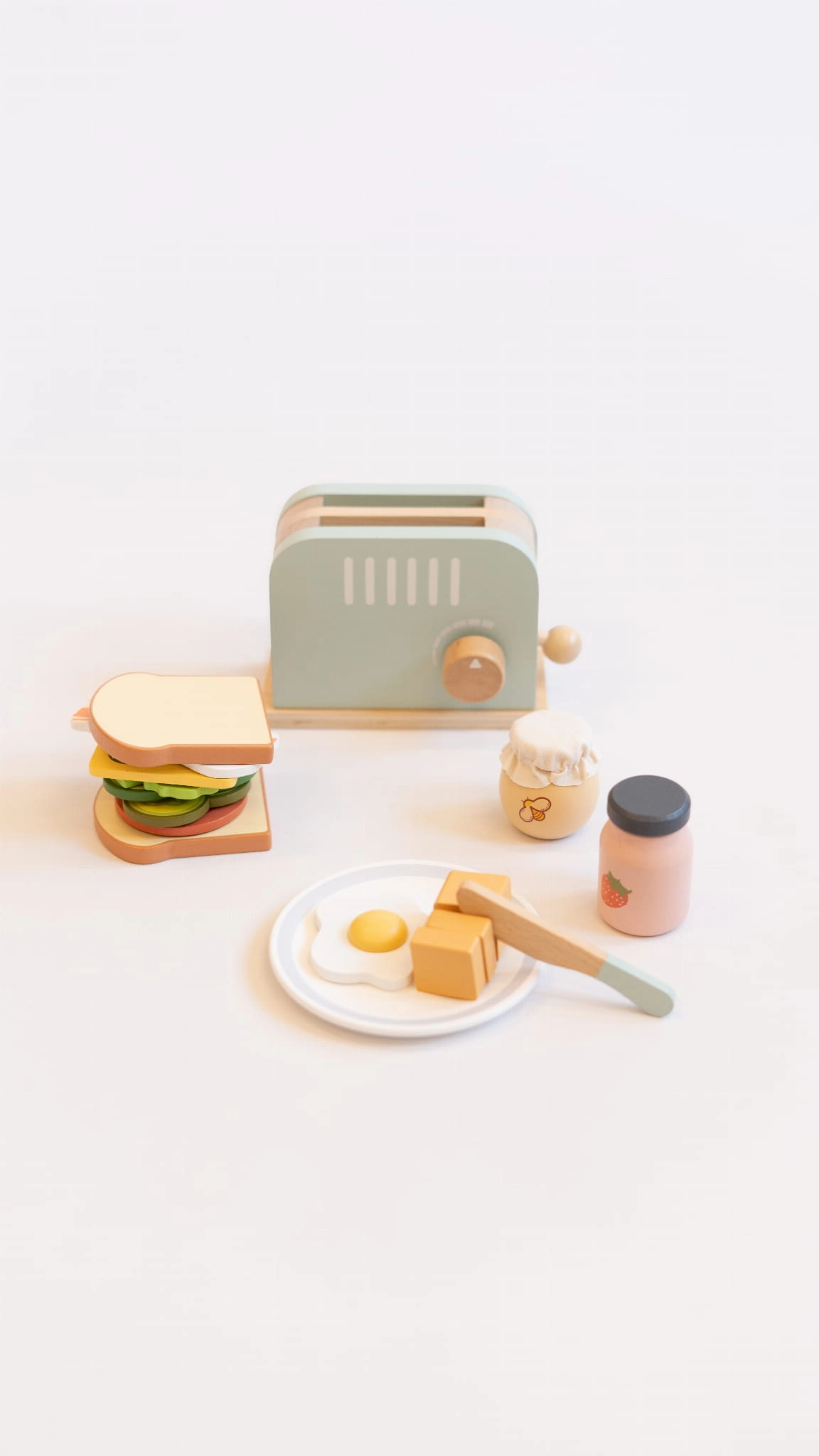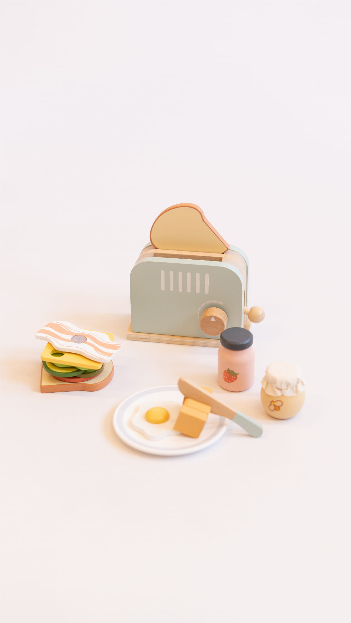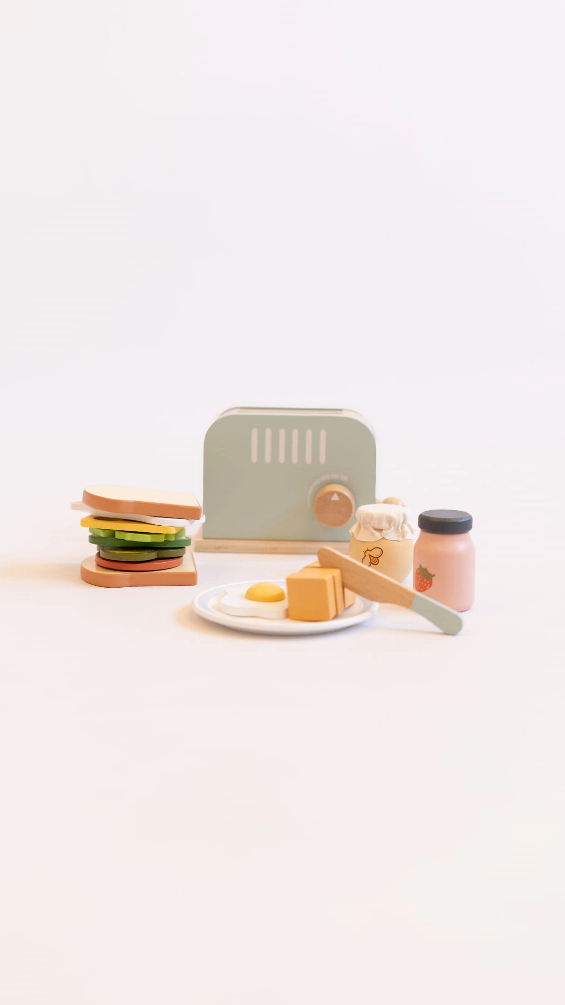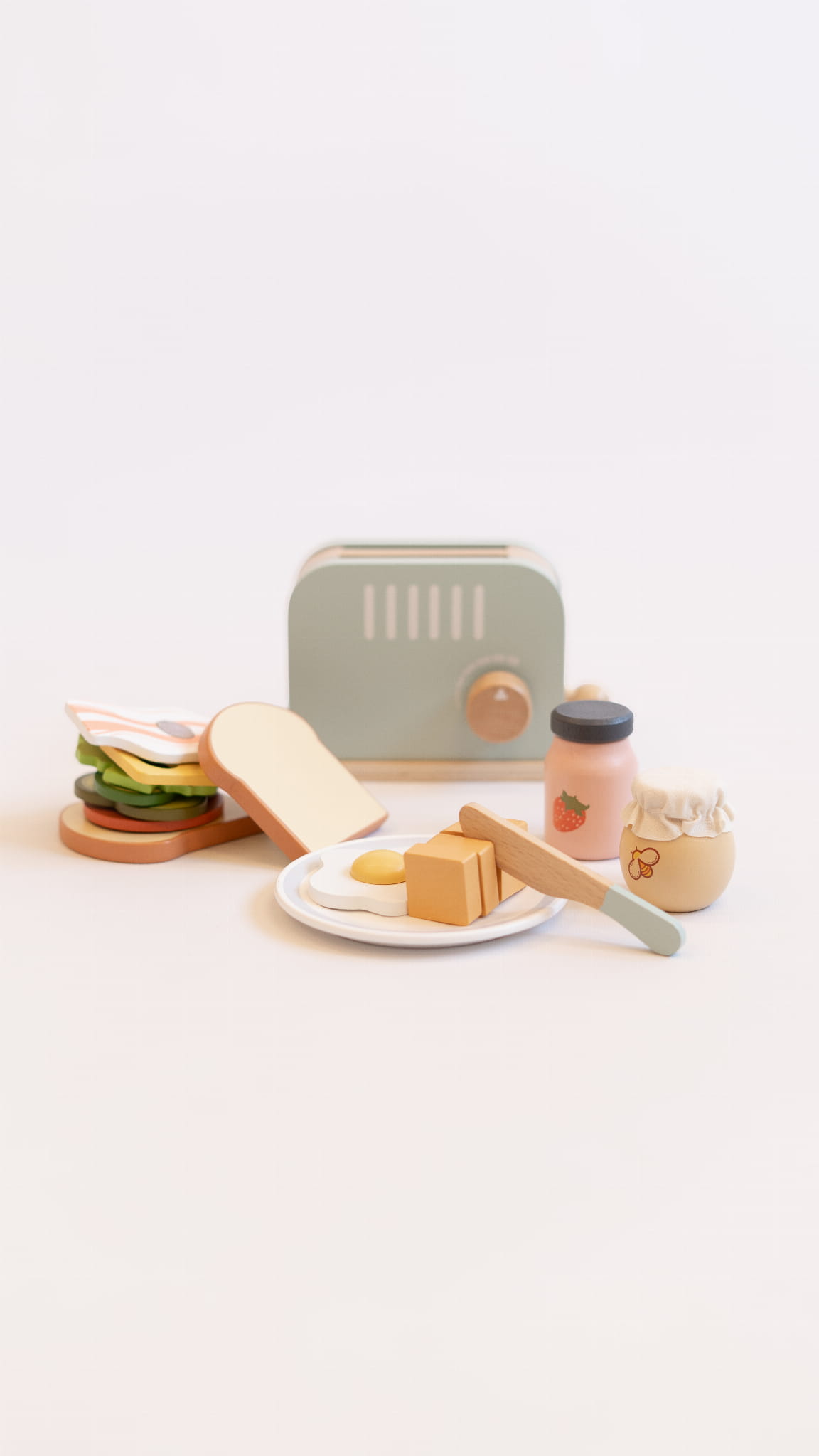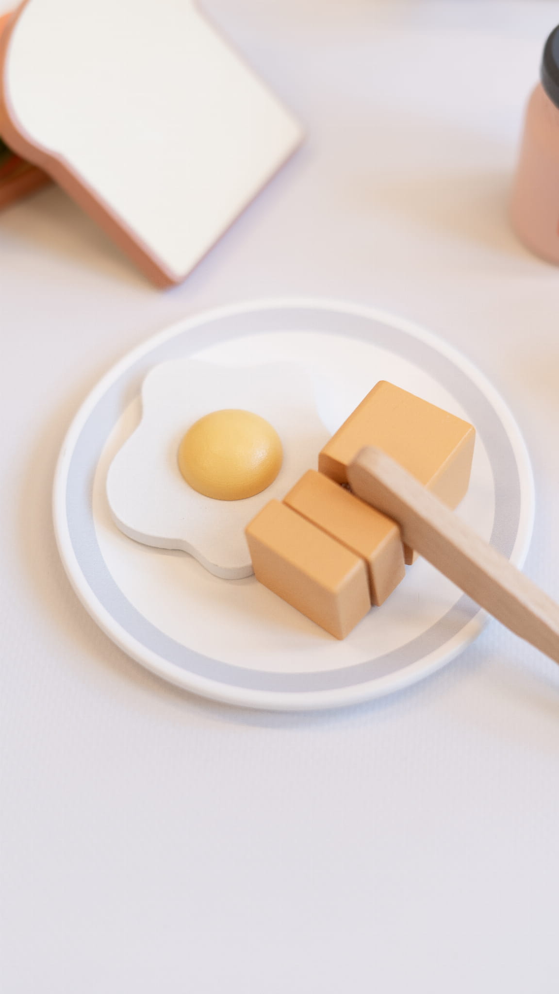 Zestaw inspirowany kuchennymi akcesoriami, które dzieci znają z codziennego życia. Dzięki różnym elementom dziecko może przygotować własne „śniadanie”, tworzyć scenariusze zabawy i naśladować dorosłych. Prosta forma oraz stonowana kolorystyka sprawiają, że zabawka dobrze komponuje się z dziecięcą kuchnią i przestrzenią zabawy.