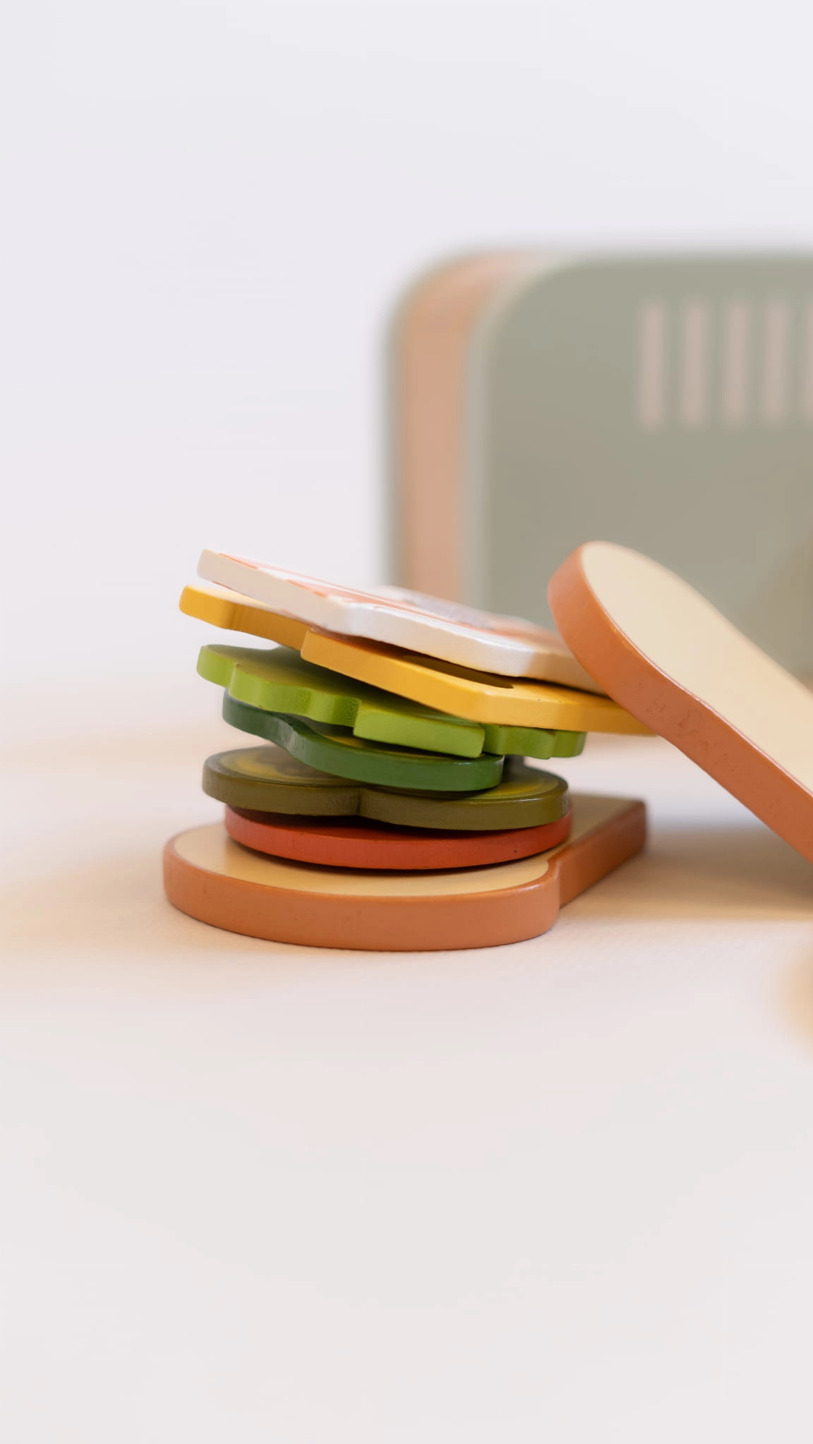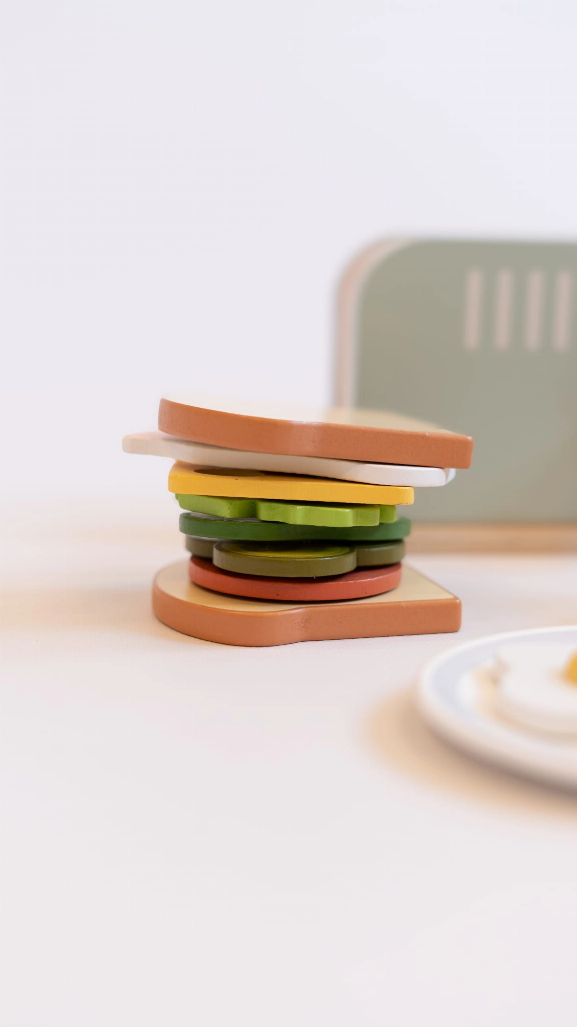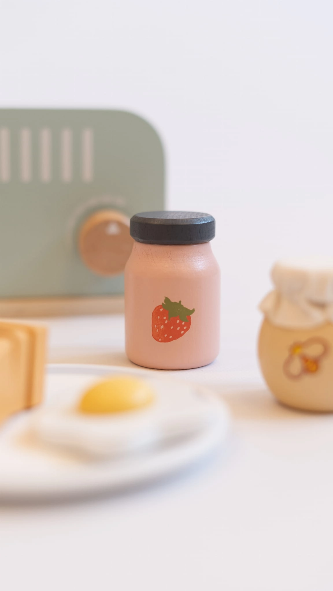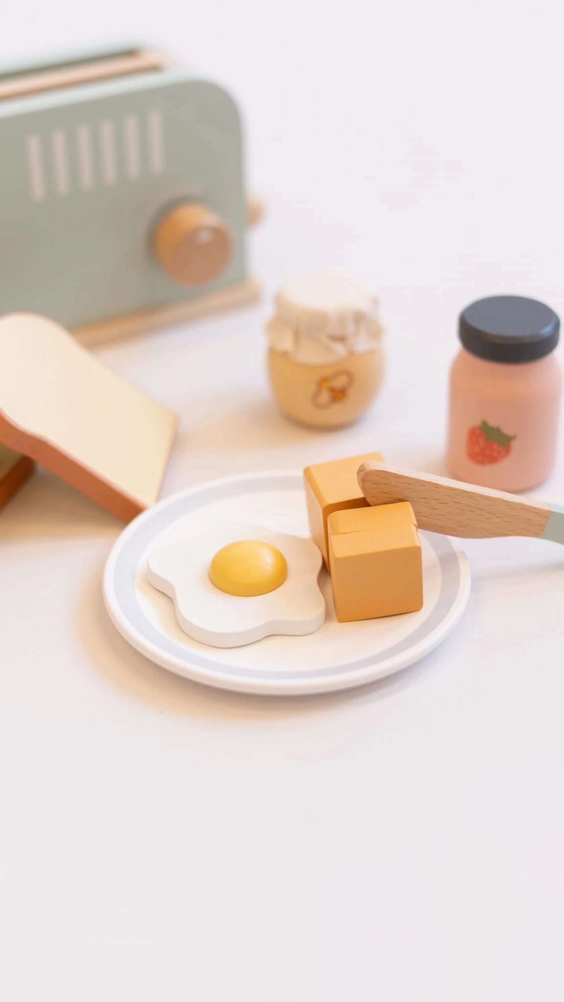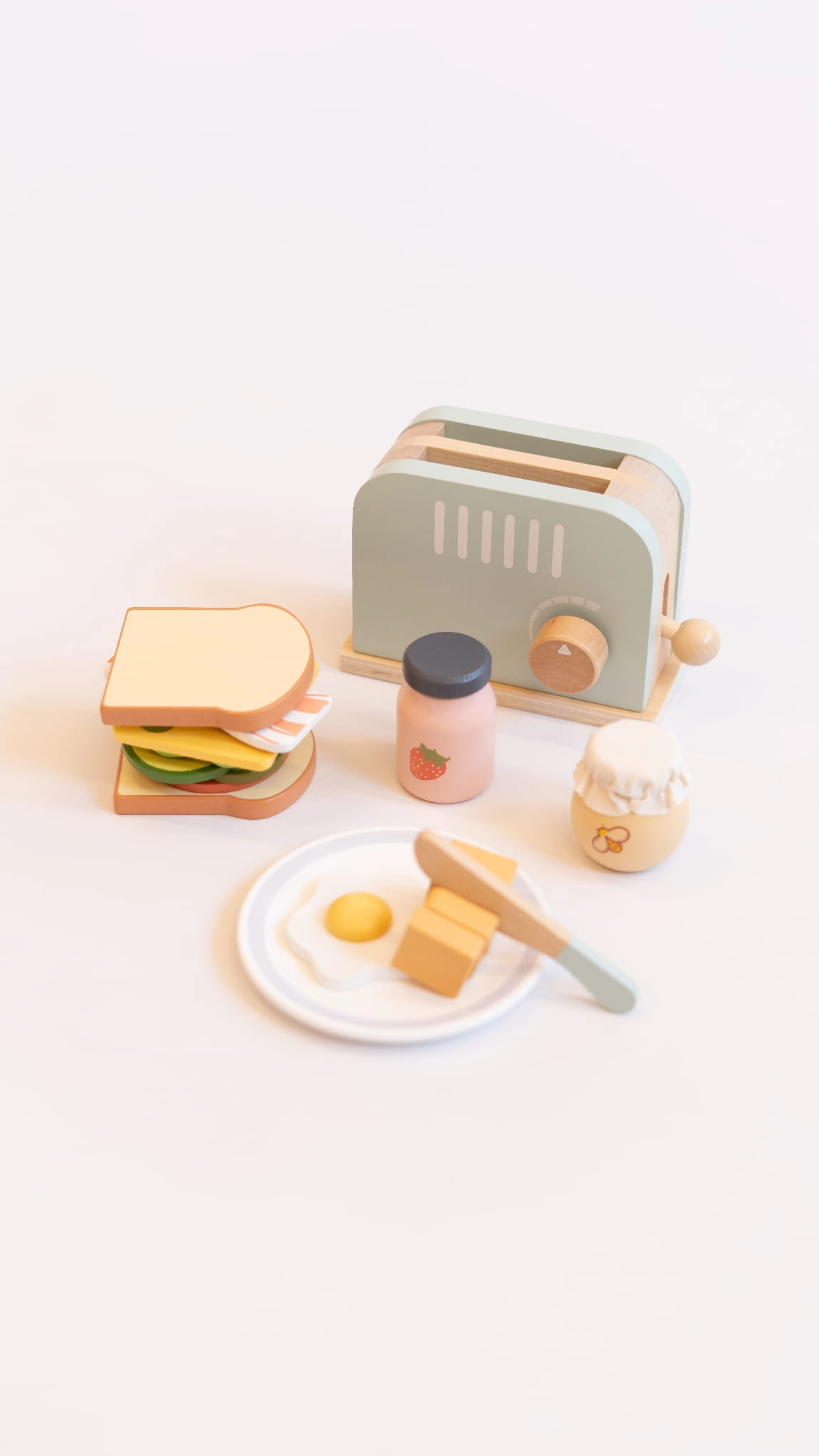 Zestaw inspirowany kuchennymi akcesoriami, które dzieci znają z codziennego życia. Dzięki różnym elementom dziecko może przygotować własne „śniadanie”, tworzyć scenariusze zabawy i naśladować dorosłych. Prosta forma oraz stonowana kolorystyka sprawiają, że zabawka dobrze komponuje się z dziecięcą kuchnią i przestrzenią zabawy.