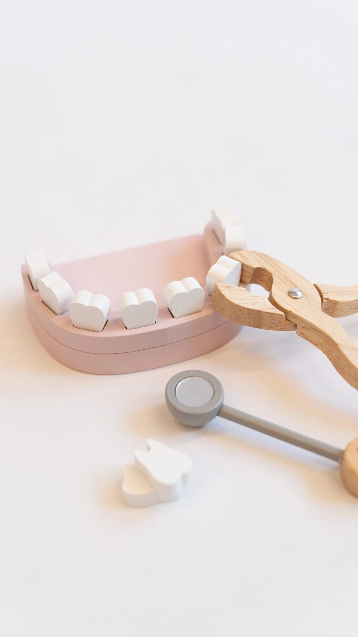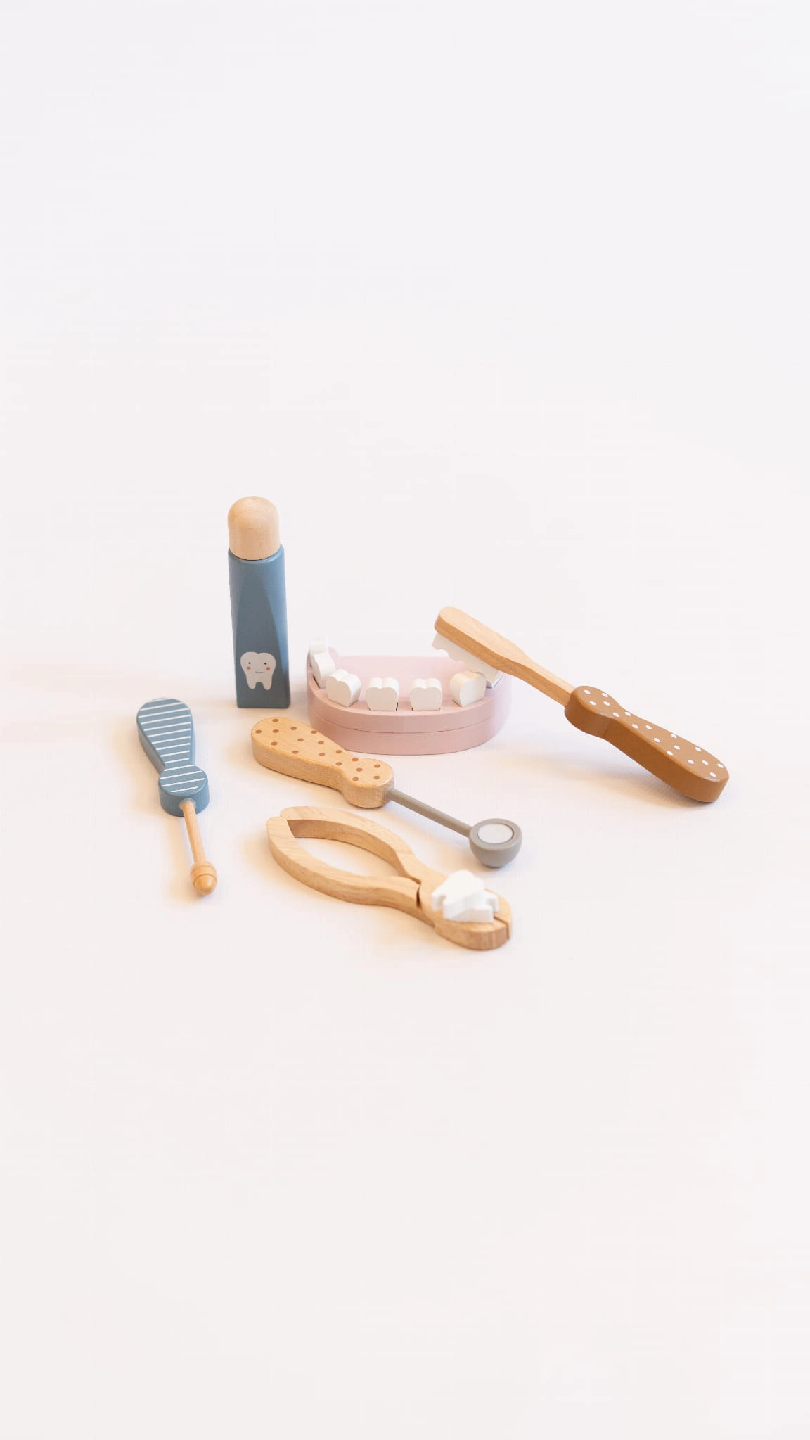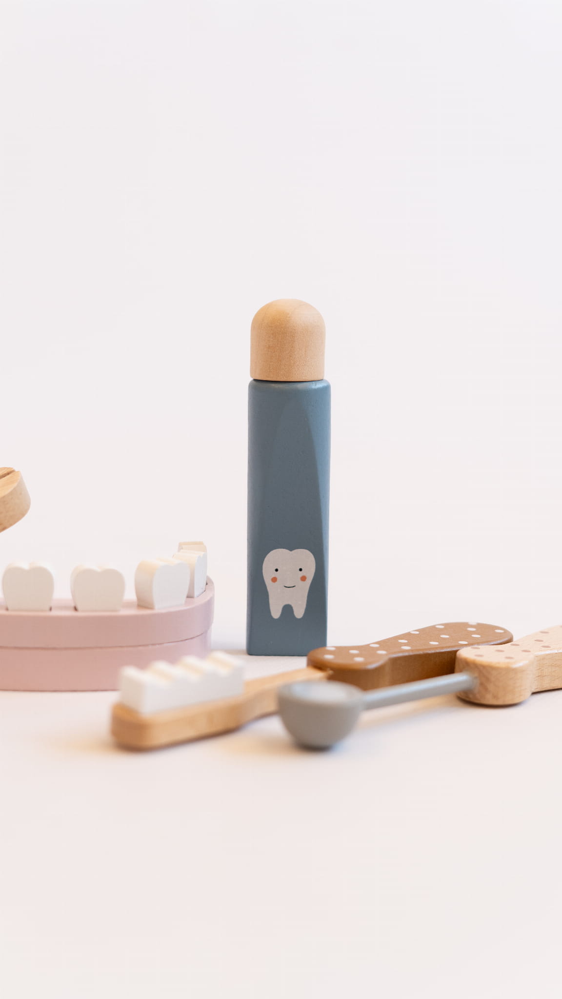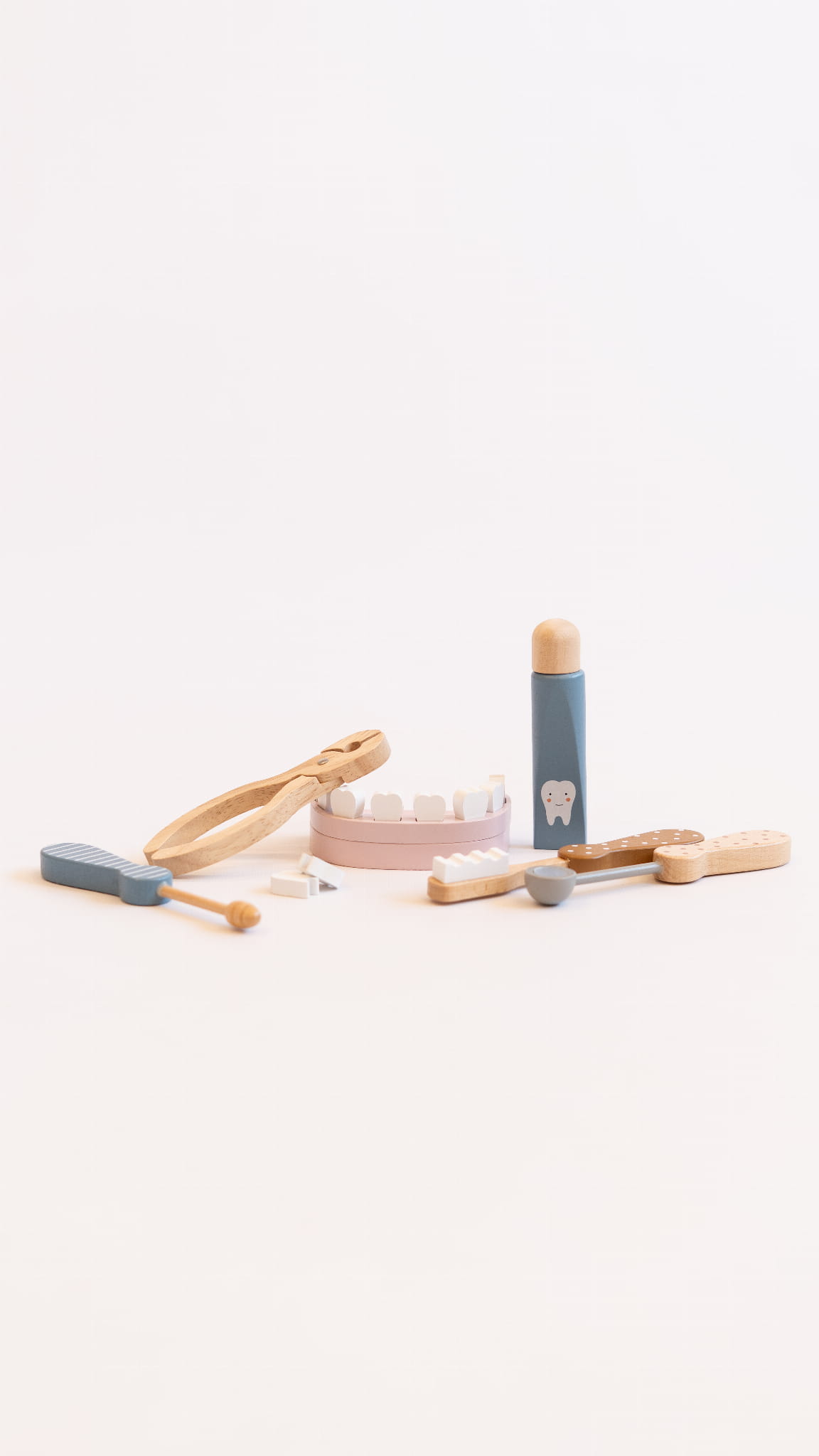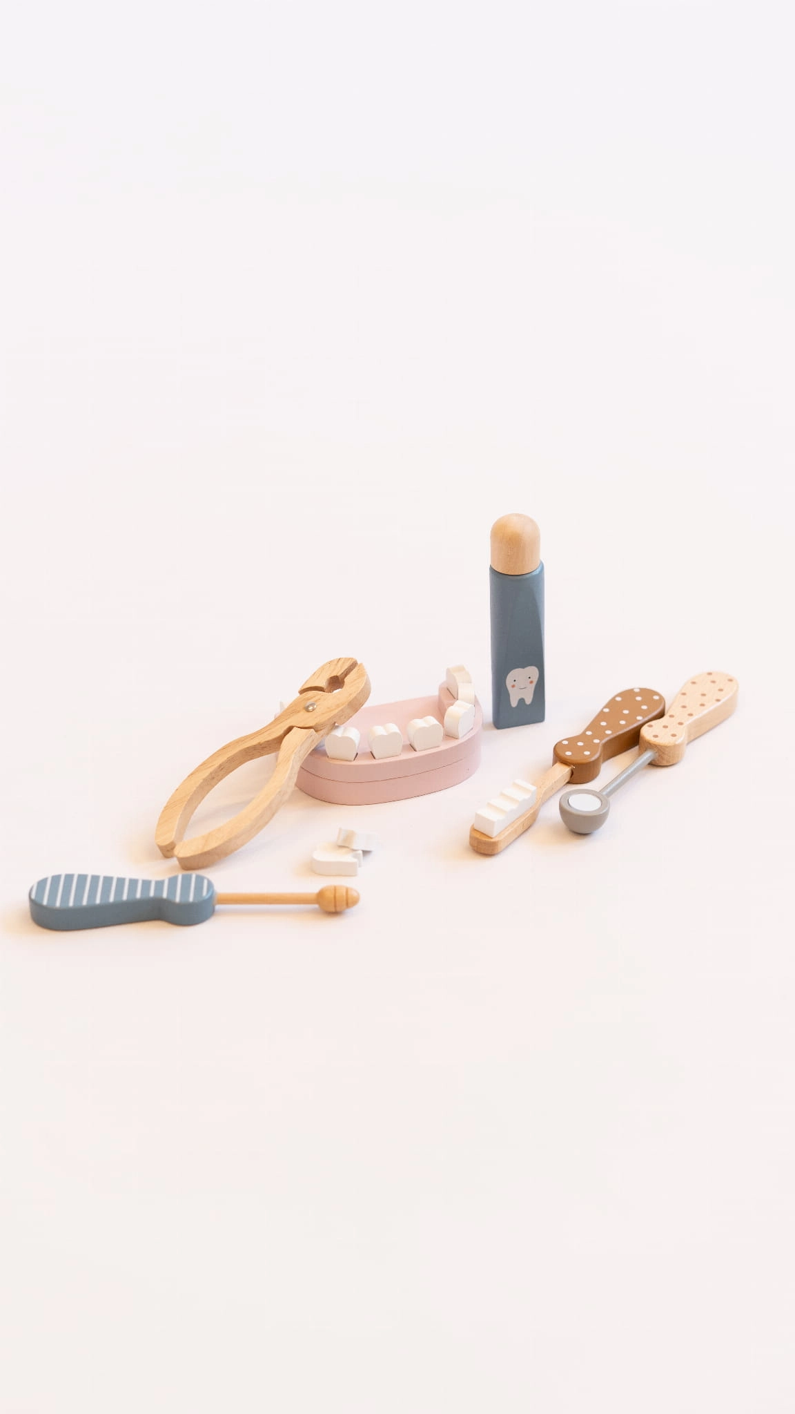 Zestaw zachęca do kreatywnej zabawy w odgrywanie ról oraz pomaga oswoić dzieci z wizytą u stomatologa. Prosta forma, delikatne kolory i staranne wykonanie sprawiają, że zabawka doskonale sprawdzi się podczas codziennej zabawy.