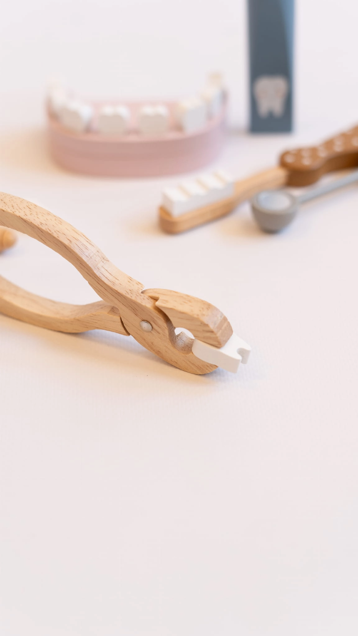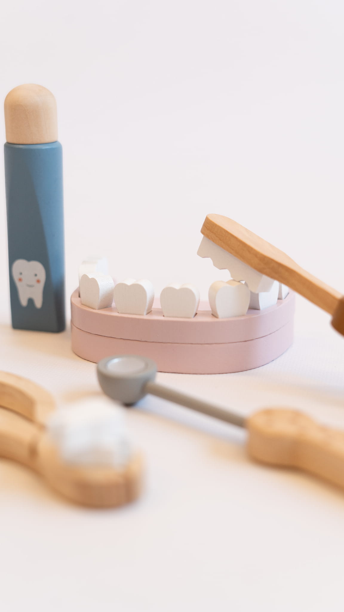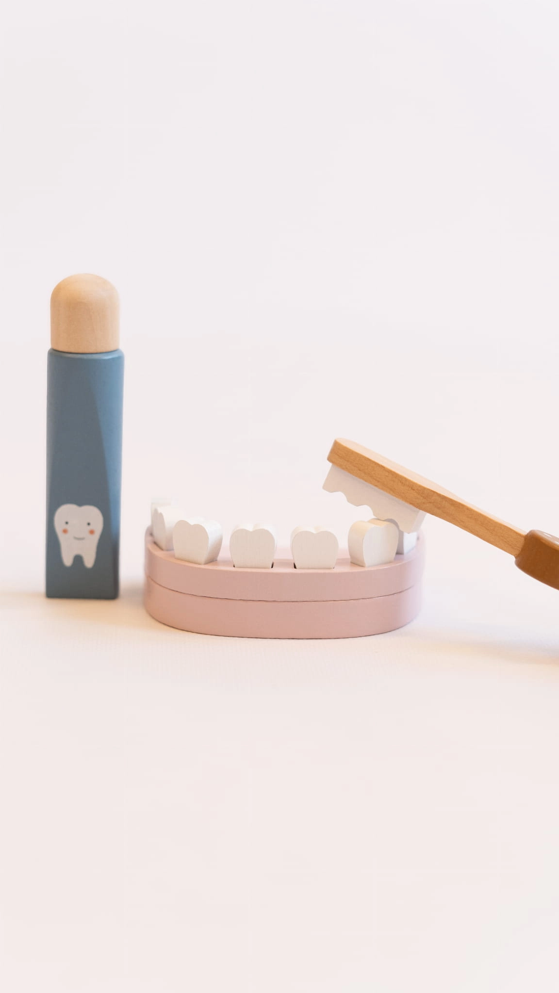 Drewniany zestaw dentystyczny dla dzieci pozwala w zabawie poznawać podstawy dbania o zdrowie zębów. Dzięki różnym akcesoriom dziecko może wcielić się w rolę dentysty, sprawdzić stan zębów i przeprowadzić własną „wizytę u dentysty”.