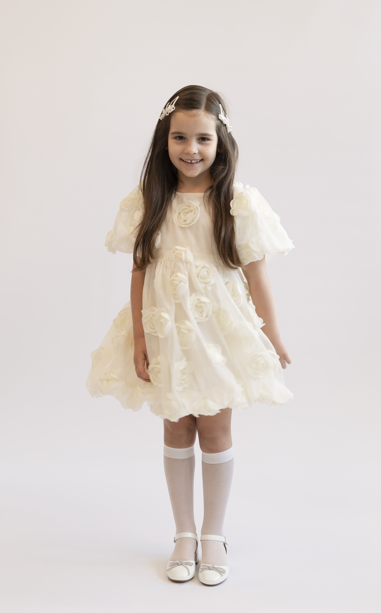 Urocza sukienka w kolorze ecru, ozdobiona kwiatami, które nadają jej wyjątkowego charakteru. Bufiaste rękawki oraz rozkloszowany krój sprawiają, że sukienka prezentuje się lekko i dziewczęco. Idealna na wyjątkowe okazje – urodziny, święta czy sesje zdjęciowe. Wykonana z miękkiego, komfortowego materiału, który zapewnia swobodę ruchów i wygodę noszenia.