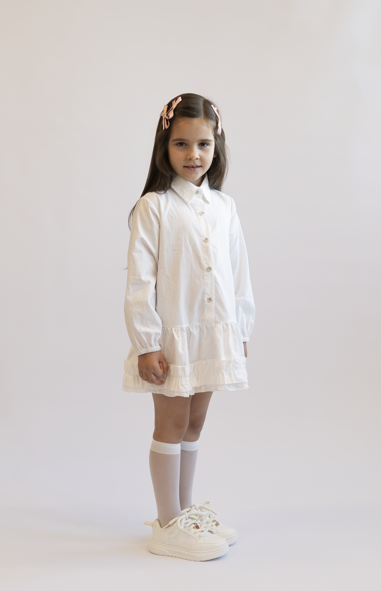 Koszulowa sukienka, która sprawdzi się na różne okazje. Wykonana z wysokiej jakości 100% bawełny, zapewniającej wygodę i komfort noszenia. Sukienka w kolorze białym, z subtelnymi falbankami u dołu, które dodają jej uroku i dziewczęcego wdzięku a klasyczny kołnierzyk dodaje całości elegancji.