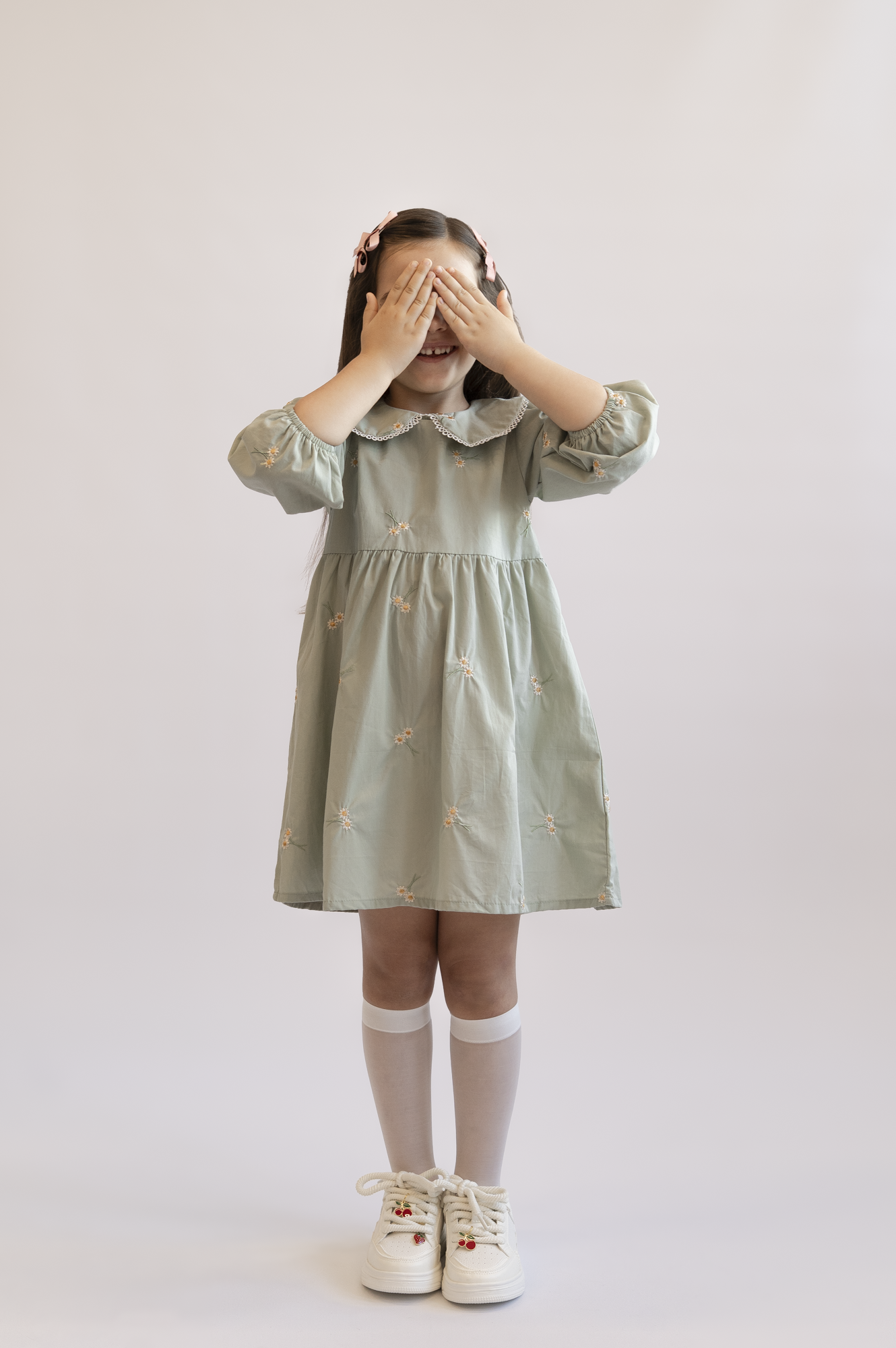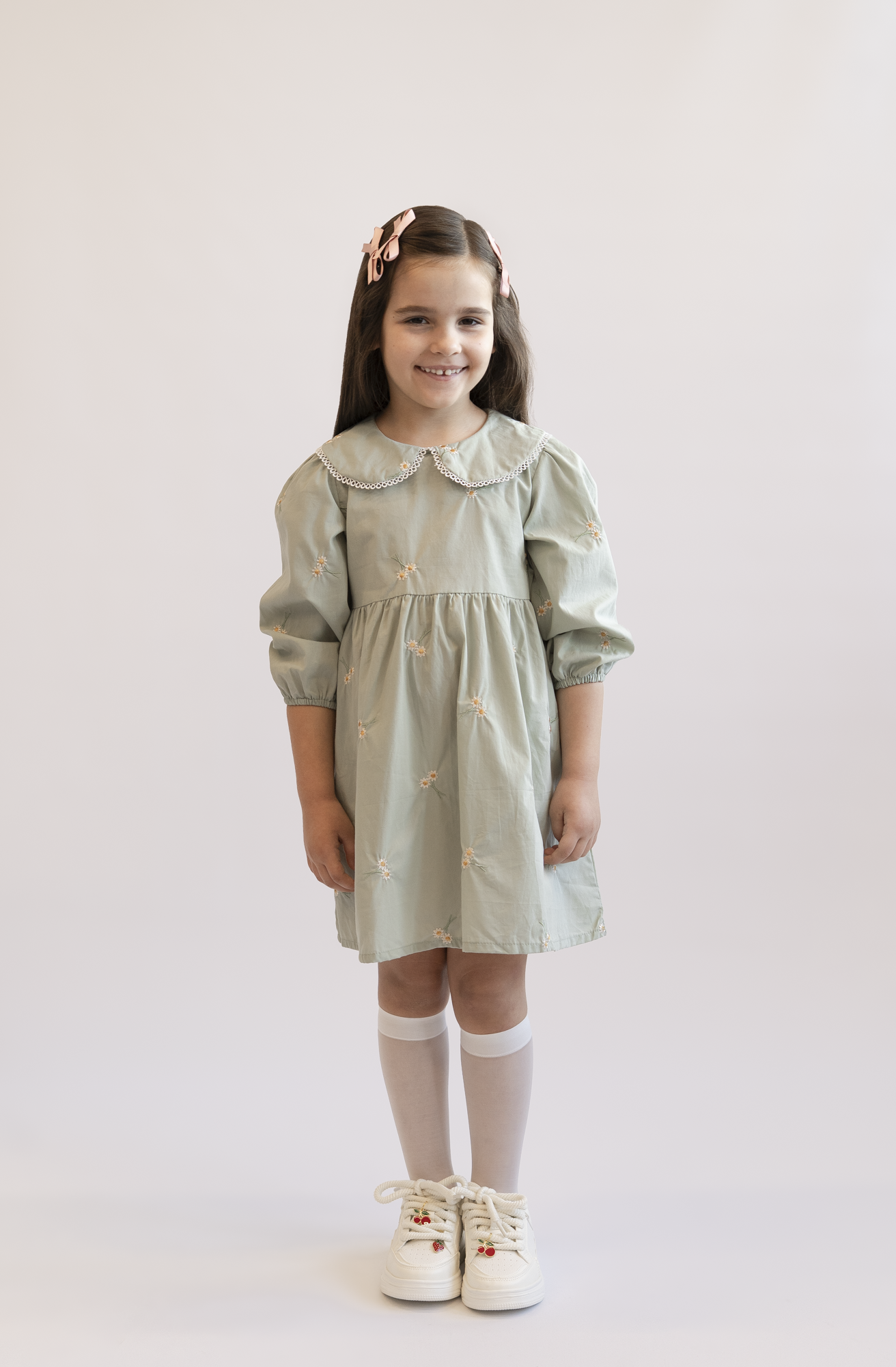 Urocza sukienka w kolorze delikatnej zieleni, ozdobiona haftowanymi kwiatami, idealna na wiosnę i lato. Sukienka ma uroczy kołnierzyk oraz rękawy zakończone gumką, co zapewnia komfort noszenia. Dodatkowo, hafty w kształcie stokrotek, umieszczone na całej sukience, nadają jej dziewczęcego uroku. Zamek błyskawiczny z tyłu ułatwia zakładanie.