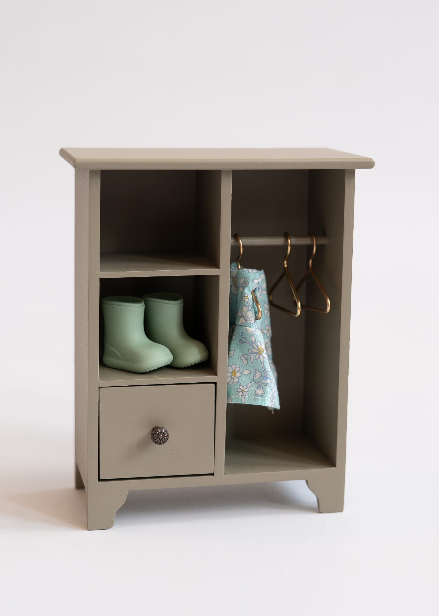 Stylowa miniaturowa szafa stworzona specjalnie z myślą o kolekcji Mysi Świat. Zawiera dekoracyjne tło w kwiatowy wzór, metalowe wieszaki oraz funkcjonalne półki i szufladkę – idealne miejsce na ubranka i drobiazgi małych mieszkańców mysiego domku.
