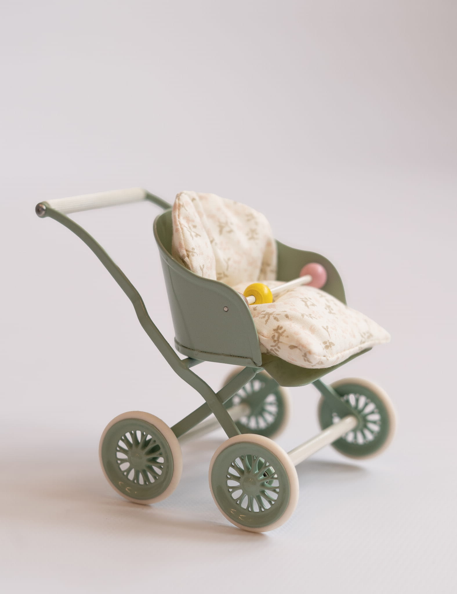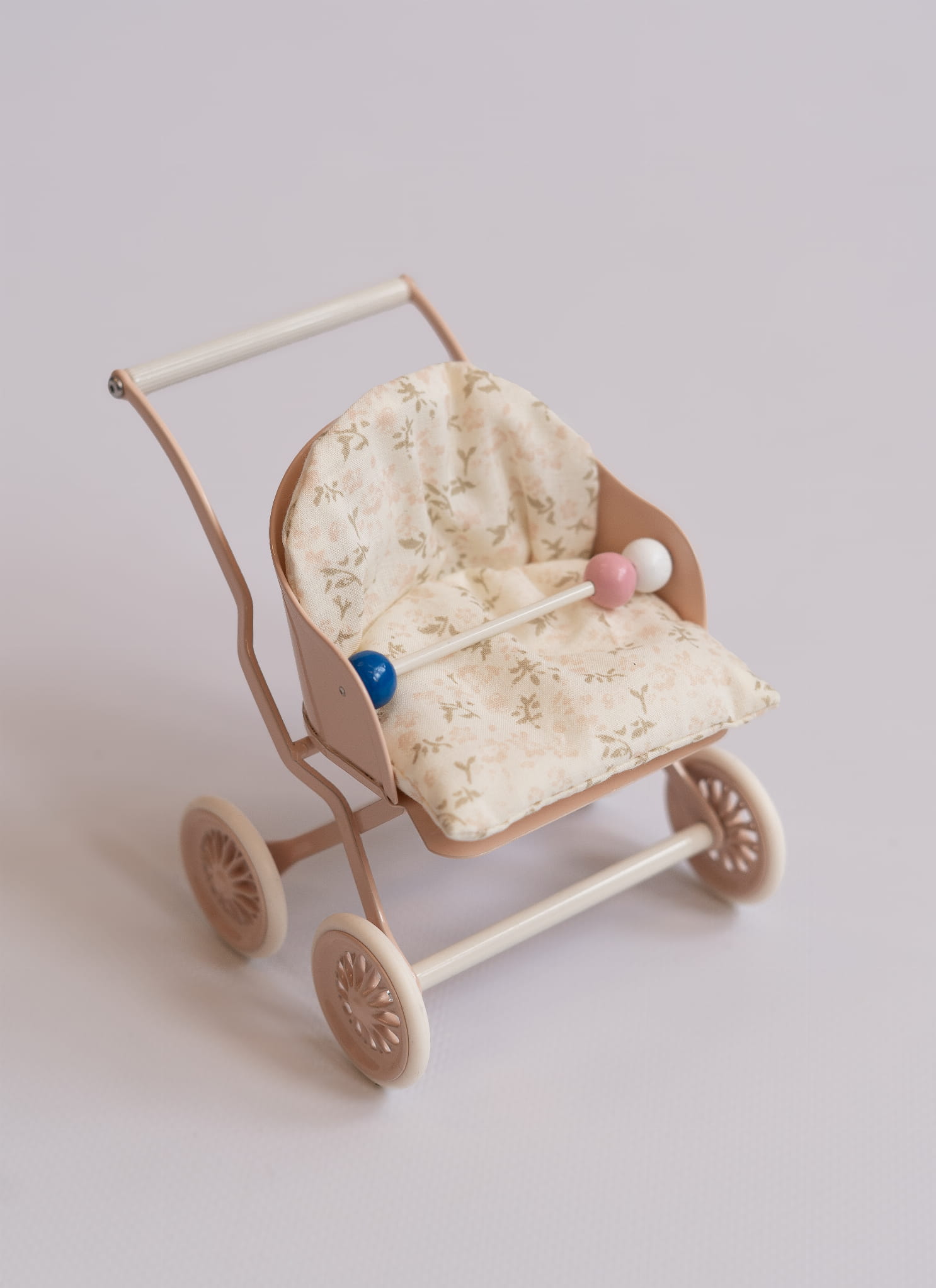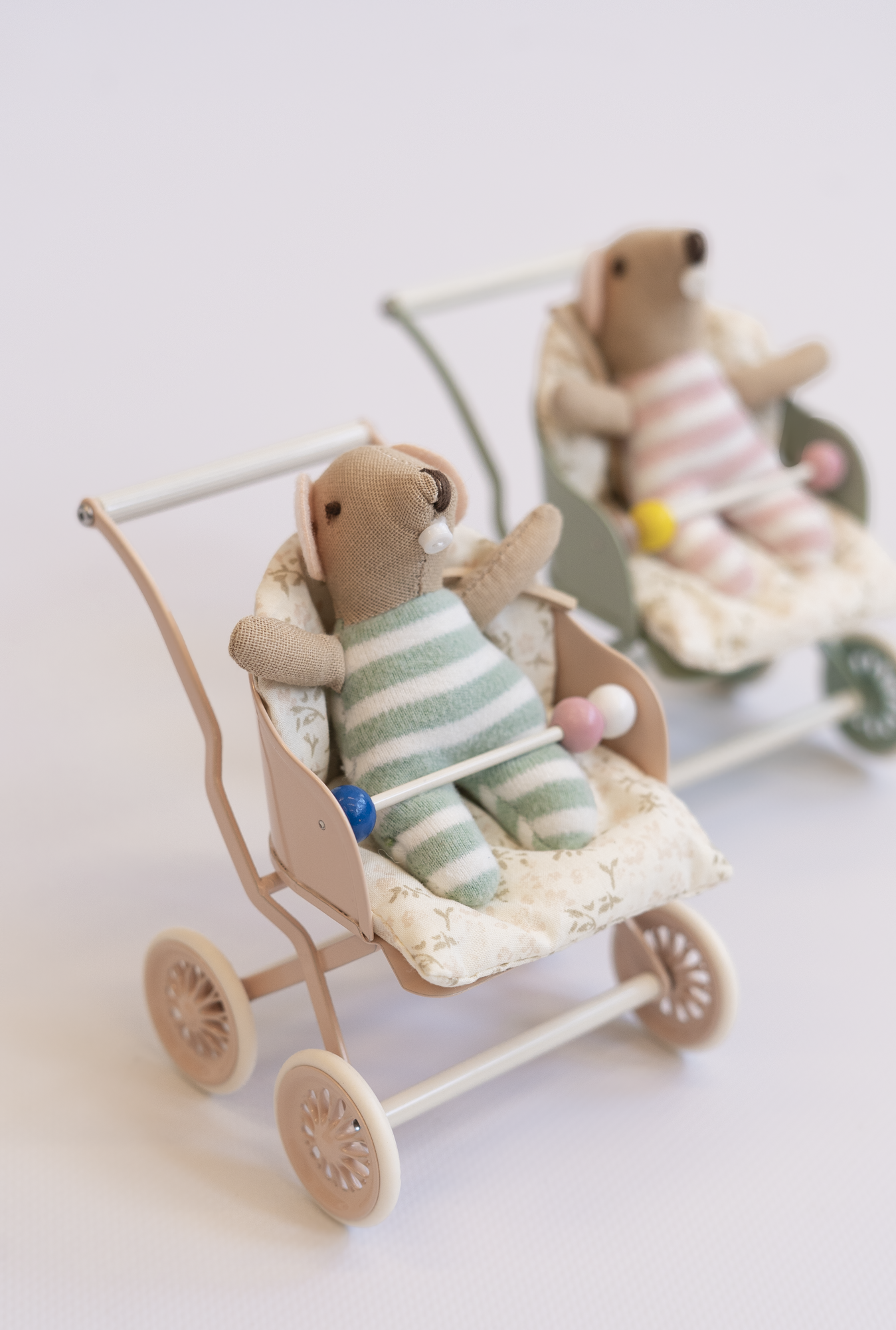 Stylowy i uroczy wózeczek stworzony z myślą o pluszowych myszkach i innych małych przyjaciołach. Wykonany z dbałością o detale, posiada miękką poduszkę w delikatny wzór oraz kolorowe koraliki (układ losowy), które nadają mu wyjątkowego uroku.